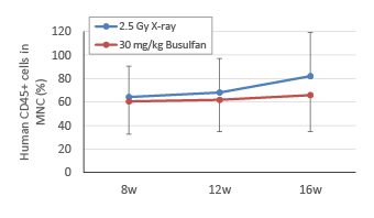 At Week 8, 12, and 16 after transplantation of human HSC, blood was collected under isoflurane anesthesia. Human cells stained with the anti-human CD45 antibody were analyzed by flow cytometry. In both 2.5 Gy X-ray irradiation and 30 mg/kg busulfan treatment groups, the same degree of engraftment of human leukocytes was observed.